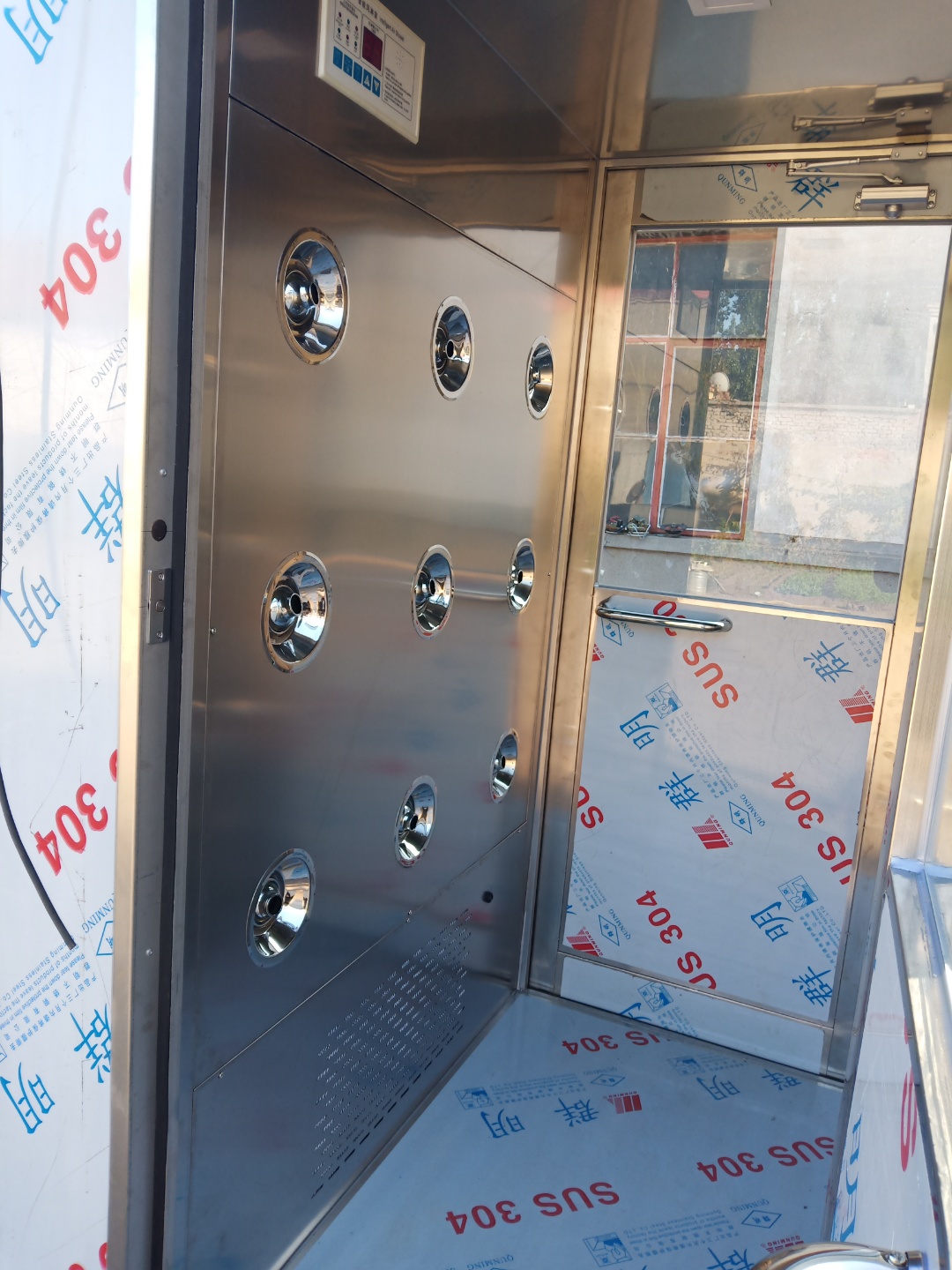 3.拉開不銹鋼風淋門人員進入風淋門后,風淋門立即自動關閉外門,紅外線感應,風淋自動啟動,吹淋15秒。