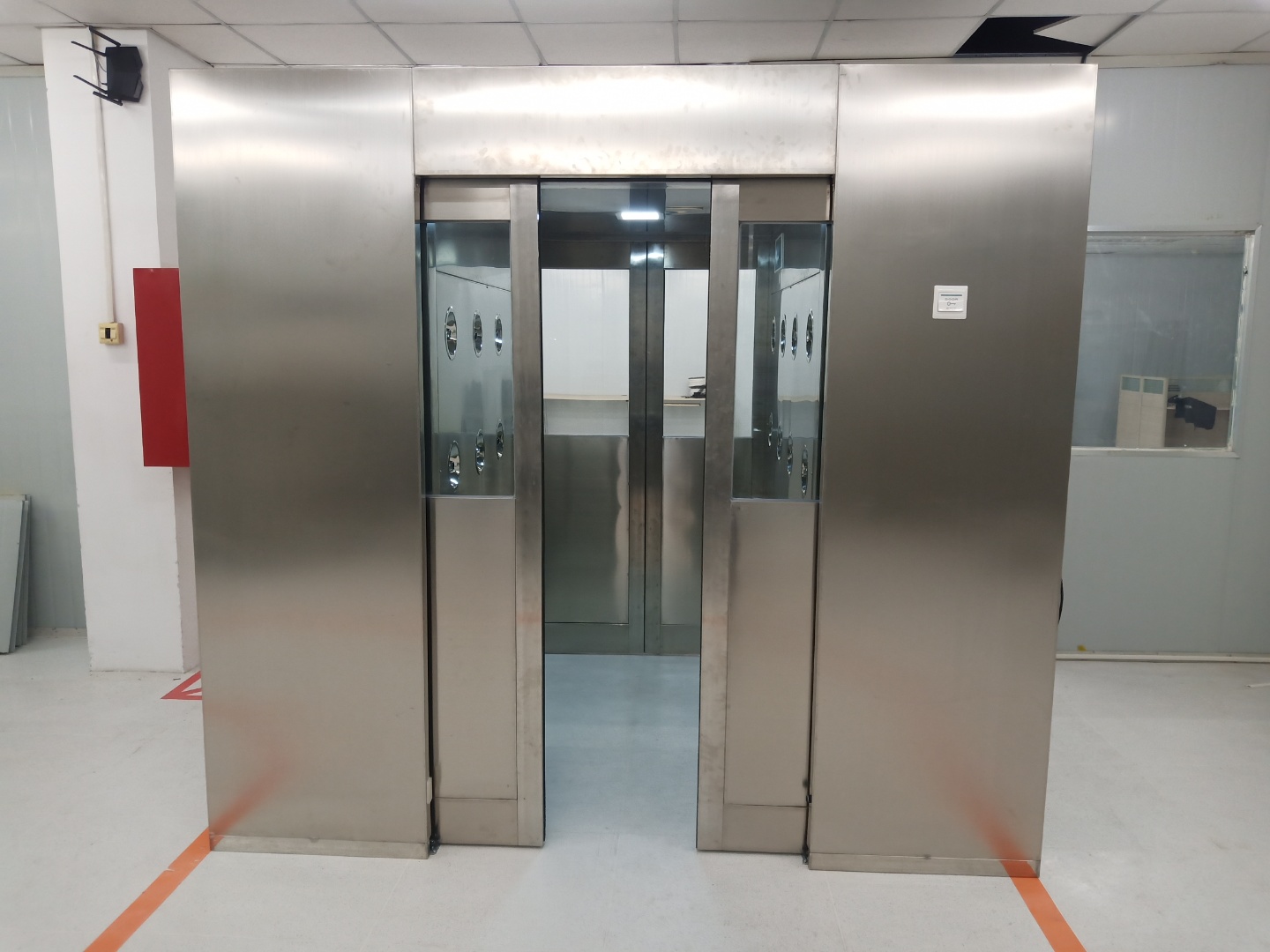 b、風淋室整箱體采用優質彩鋼板制造,美觀大方,可根據客戶尺寸訂做。