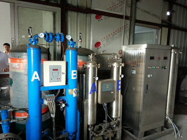 氣源的選擇要結合臭氧發生量、場地條件、能耗、運行管理、維護等因素綜合考慮。臭氧發生器的氣源為空氣或氧氣。采用空氣為氣源時,由于空氣中含有較高的水分和灰塵,不僅影響臭氧的產量,而且會破壞介電體,因此需對空氣進行除塵和脫水干燥,但省去了氣源費用。以氧氣為氣源時,相比空氣氣源,耗電量小,節省動力費用,占地少,但購買氧氣也增加了運行成本,并且需經常更換氧氣瓶,日常管理麻煩。考慮到電力供應充足,消毒間比較寬敞,工程選用空氣為氣源。